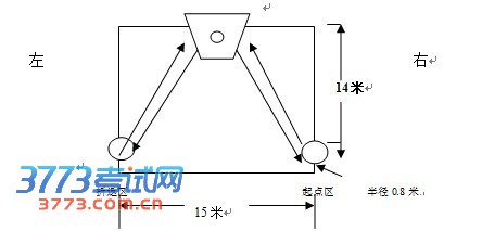 1.场地器材:标准篮球场半个(15*14米)橡胶篮球、专用测试仪器、IC卡读卡器等。篮圈与地面平行,离地面高度3.05米,并悬挂篮网。以中线与边线的相交点为圆心(0.8米为半径)作弧,成1/4圆作为运球的起点区,另一对应点作为折返。(测试场地见图示)