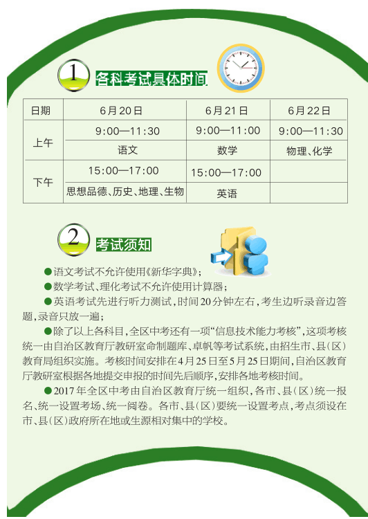 3月22日,宁夏教育厅下发《关于做好2017年全区初中毕业暨高中阶段招生考试工作的通知》(以下简称《通知》),中考各科考试具体时间确定,考务管理细则下发各地,中考报名时间由各市教育局自行确定,阅卷全部在网上进行。(记者 陈勇)