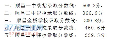 现将今年我县高中录取最低控制分数线通告如下:一、顺昌一中统招录取分数线: 506.2分,二、顺昌二中统招录取分数线: 366.9分三、 顺昌金桥学校录取分数线: 300.8分,四、顺昌一中择校录取分数线: 460.6分五、顺昌二中择校录取分数线: 339.5分