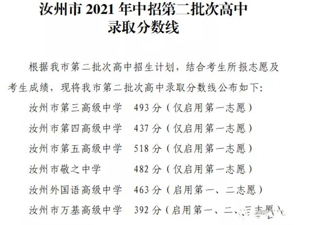 2021年河南平顶山汝州中考第二批普高录取分数线