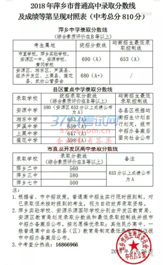 、2018年萍乡市普通高中录取分数线及成绩呈现对照表