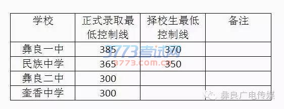 经学校行政研究决定,经上级教育部门审核同意,彝良县第一中学2016年高一新生录取分数线确定:正式生录取分数线:385分;择校生录取分数线:370分