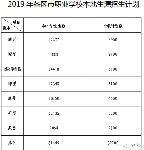 2019年,全市初中毕业生约8.1万人,共计划招收中职学生3.7万人,其中本地生源3.2万人。中等职业学校招生形式,包括中职与本科“3+4”对口贯通分段培养(以下简称“3+4”本科)、高等师范教育专科、五年制高等职业教育(含五年一贯制和三二连读高职)、普通中专、职业中专、技工教育(各区市本地生源职业学校招生计划)。