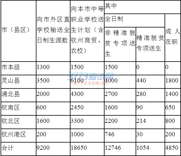 (一)根据《广西壮族自治区中长期教育改革和发展规划纲要(2010-2020年)》及自治区教育厅招生工作目标要求,2017年下达我市中等职业学校、技工学校招生送生目标任务数与去年持平。各县、区要按照高中阶段教育学校招生职普比例大体相当的原则,合理分解并下达明确的中等职业学校招生和送生计划,确保完成今年的招生、送生任务。2017年钦州市中等职业学校招送生计划分解表见附件1,2017年钦州市中等专业学校招生计划分解表见附件2。各县、区向区内(含本市)中专、技校送生及本市招生(含全日制和成人在职)数量为评价各县、区完成2017年中等职业学校招生工作的考核指标,必须确保完成。送生数量按生源户口所在地进行统计。
