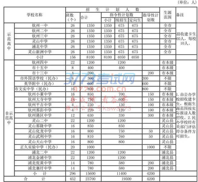 钦州市2017年普通高中招生计划表