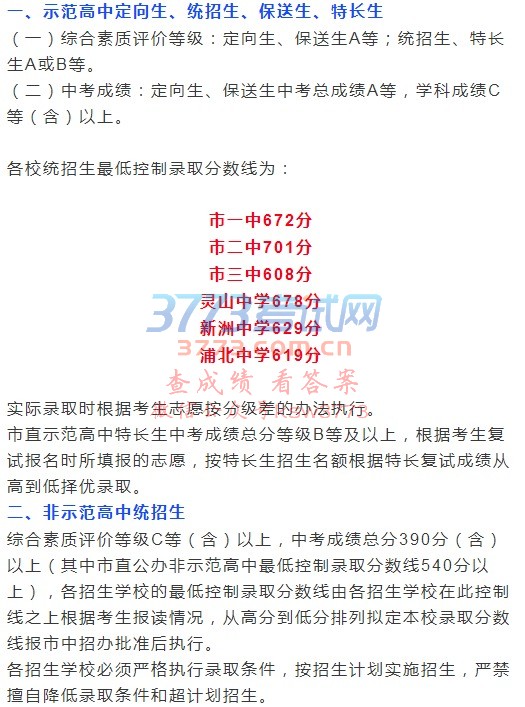 综合素质评价等级C等(含)以上,中考成绩总分390分(含)以上(其中市直公办非示范高中最低控制录取分数线540分以上),各招生学校的最低控制录取分数线由各招生学校在此控制线之上根据考生报读情况,从高分到低分排列拟定本校录取分数线报市中招办批准后执行。