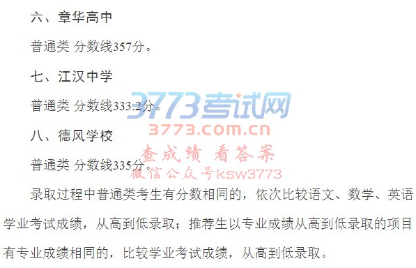 六、章华高中普通类 分数线357分。七、江汉中学普通类 分数线333.2分。八、德风学校普通类 分数线335分。录取过程中普通类考生有分数相同的,依次比较语文、数学、英语学业考试成绩,从高到低录取;推荐生以专业成绩从高到低录取的项目有专业成绩相同的,比较学业考试成绩,从高到低录取。