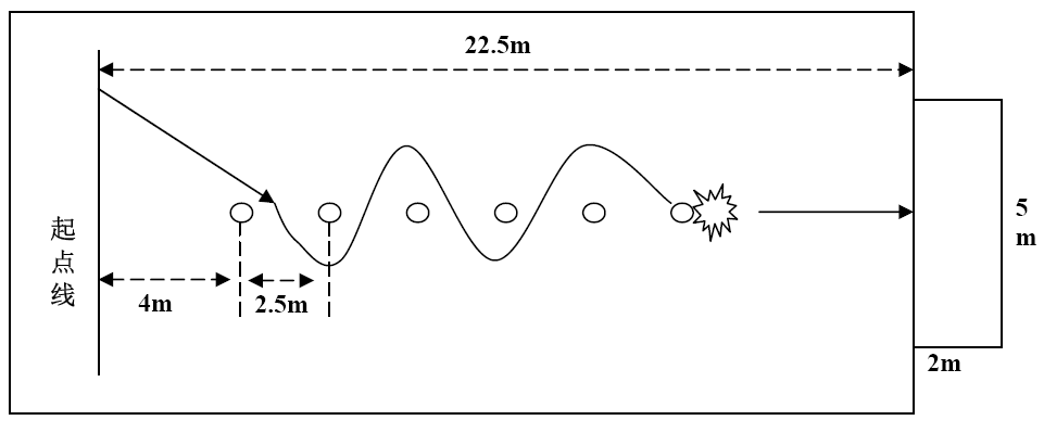 1.场地器材:场地设置在田径场中部的平整场地面或独立的足球场上,表面为天然或人工草坪(不能为光滑的硬地),球门规格为5米*2米。按上图所示布置,起点线至球门线全长22.5米,往球门方向4米处设置第一根杆,之后每隔2.5米放一杆,共设6根杆。