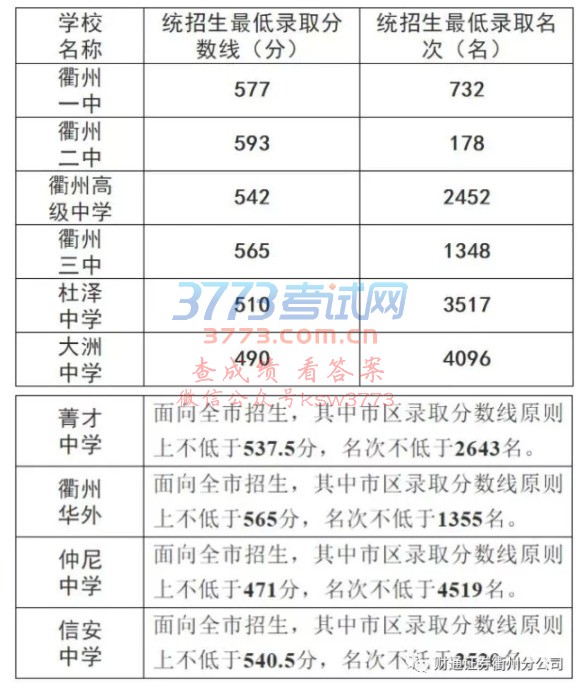 根据省教育厅相关文件,衢州一中、衢州二中、衢州高级中学和衢州三中等省级重点中学面向市区各初中的指标分配生分数线控制在招生学校统招生最低录取分数线的25分以内,实行分校录取,未完成计划转为统招生计划。