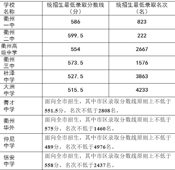 2019年衢州市区普通高中录取分数线
