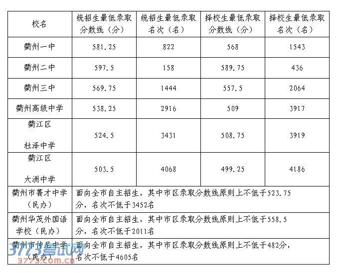 2013年浙江衢州中考录取分数线已经公布,具体如下: