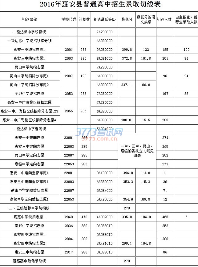 2016惠安嘉惠中学分数线 嘉惠中学录取切线