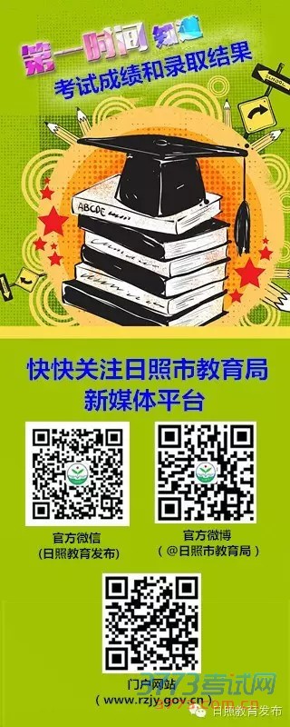 2015日照中考成绩查询入口-日照市教育局网站。日照市教育局“三位一体”新媒体平台——官方微信(日照教育发布)、官方微博(@日照市教育局)、门户网站(www.rzjy.gov.cn)将在第一时间公布考试成绩和录取结果,请扫描下列二维码,关注我们,并分享给需要的家长们吧!