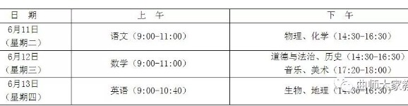 4.文化课和艺术(音乐和美术)。全市统一于6月11日至13日进行,具体安排如下: