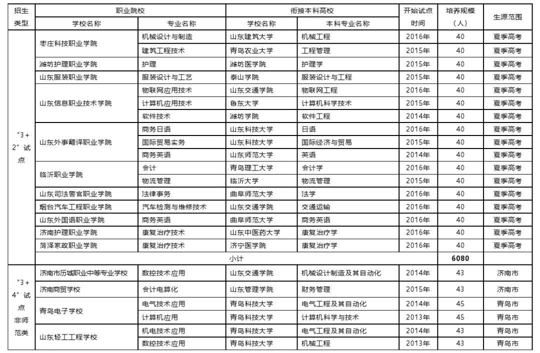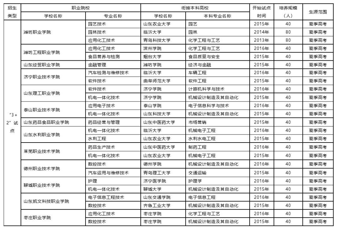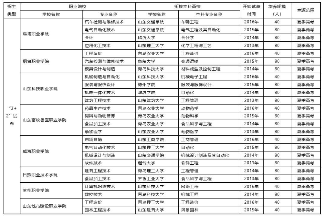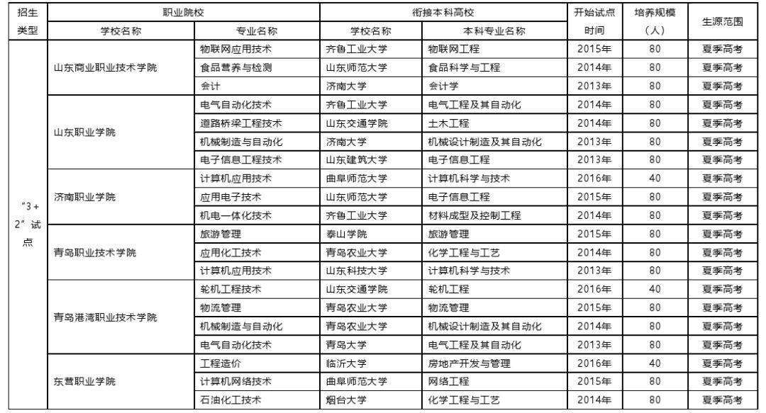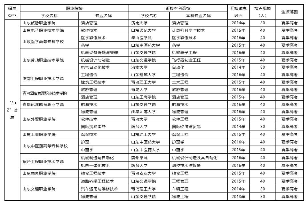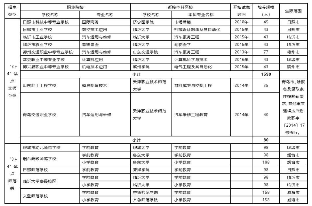 根据《山东省人民政府关于加快建设适应经济社会发展的现代职业教育体系的意见》(鲁政发〔2012〕49号)、《山东省人民政府关于贯彻国发〔2014〕19号文件进一步完善现代职业教育政策体系的意见》(鲁政发〔2015〕17号)和《山东省人民政府办公厅关于贯彻落实鲁政发〔2012〕49号文件推进现代职业教育体系建设的实施意见》(鲁政办字〔2013〕126号)要求,经研究,我厅确定了2018年职业院校与本科高校对口贯通分段培养试点学校、专业及培养规模。现将有关事项通知如下: