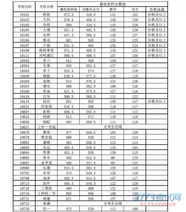 2014上海民远中学常青中学分数线(黄浦区