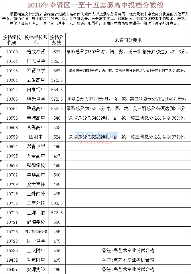 2016年奉贤区中招一至十五志愿高中学校投档线