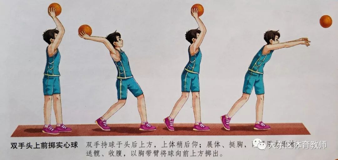 握球和持球:两手十指自然分开把球放在两手掌,两大拇指紧扣在球的后上方成“八”字,其余四指放在球的两侧将球夹持,以保持球的稳定。双手下垂自然置于身体前下方。进行一至两次预摆。
