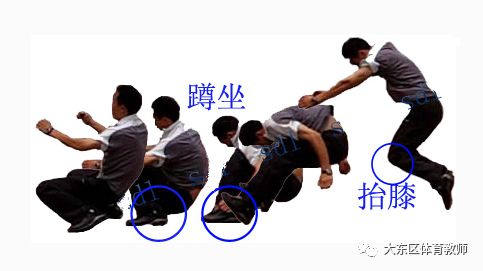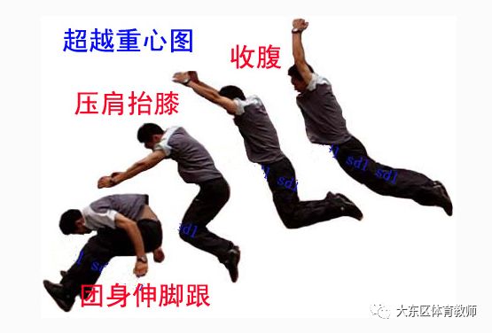 ↑腾空:在空中充分展体,准备完成快速收腹抬膝伸小腿的超越重心动作。