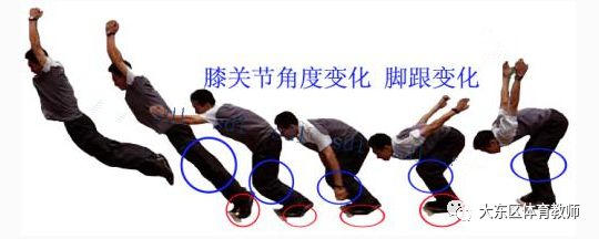 ↑落地缓冲:收腹举腿,小腿往前伸,同时双臂用力往后摆动,并屈膝落地缓冲。