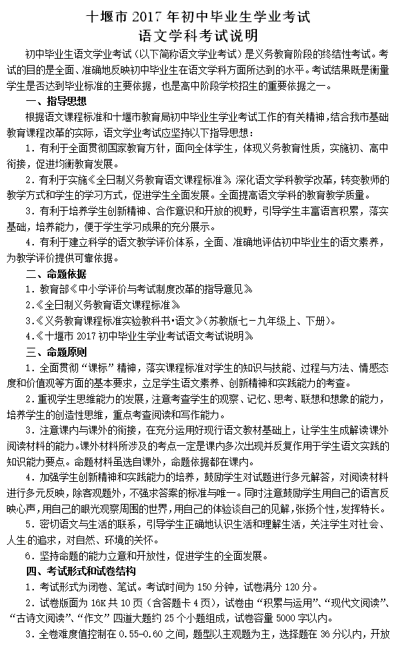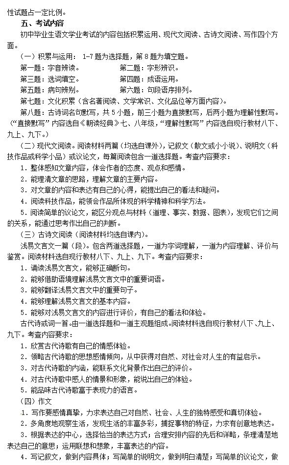 初中毕业生语文学业考试(以下简称语文学业考试)是义务教育阶段的终结性考试。考试的目的是全面、准确地反映初中毕业生在语文学科方面所达到的水平。考试结果既是衡量学生是否达到毕业标准的主要依据,也是高中阶段学校招生的重要依据之一。