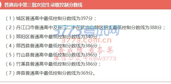 普通高中第三批次招生录取控制分数线(1)城区普通高中最低控制分数线为397分; (2)丹江口市普通高中及丹江二中在武当山特区招生最低控制分数线为388分;(3)郧阳区普通高中最低控制分数线为340分;(4)郧西县普通高中最低控制分数线为386分;(5)竹山县普通高中最低控制分数线为396分;(6)竹溪县普通高中最低控制分数线为386分;(7)房县普通高中最低控制分数线为369分。