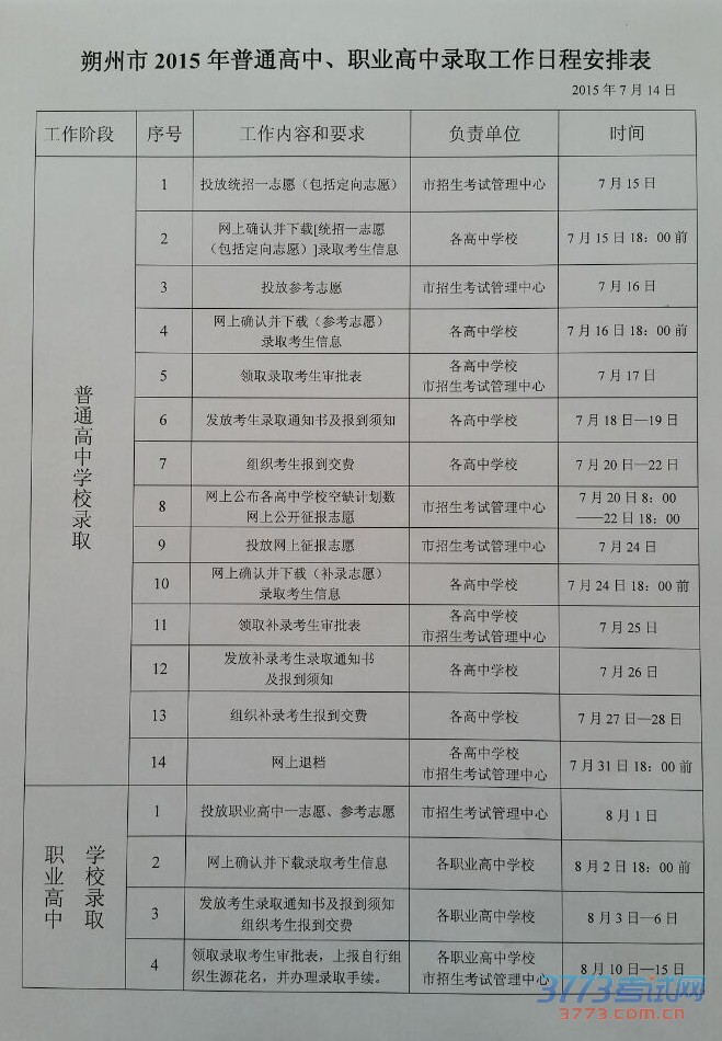 2015年朔州市普通高中、职业高中招生工作将于7月中旬进行,具体安排如下表: