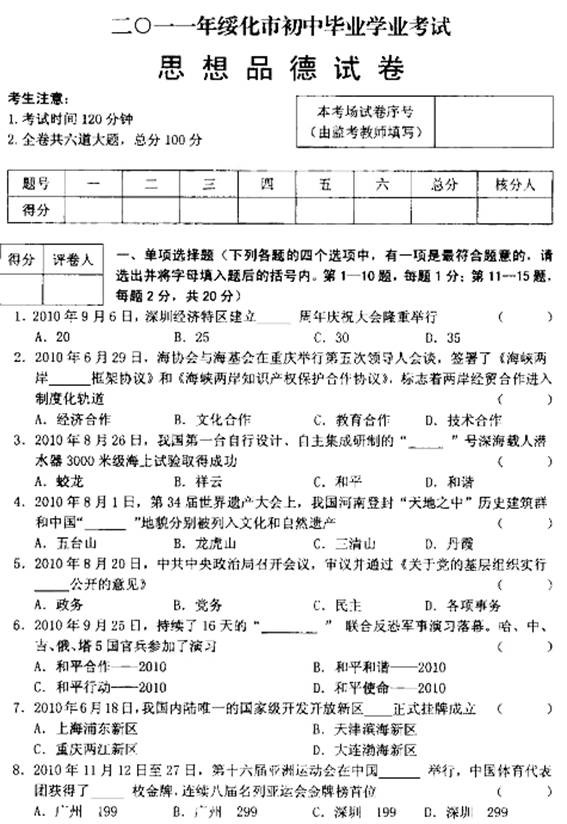 2011绥化中考思想品德(政治)试题试卷及参考答案