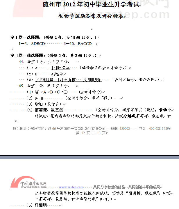 2012年随州中考理综生物试题答案