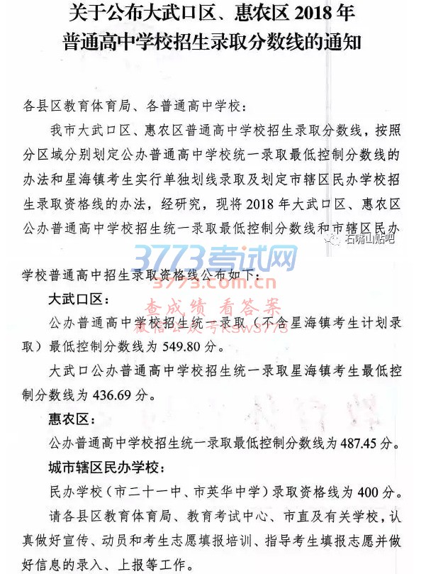 石嘴山大武口区、惠农区2018年普通高中学校招生录取分数线的通知
