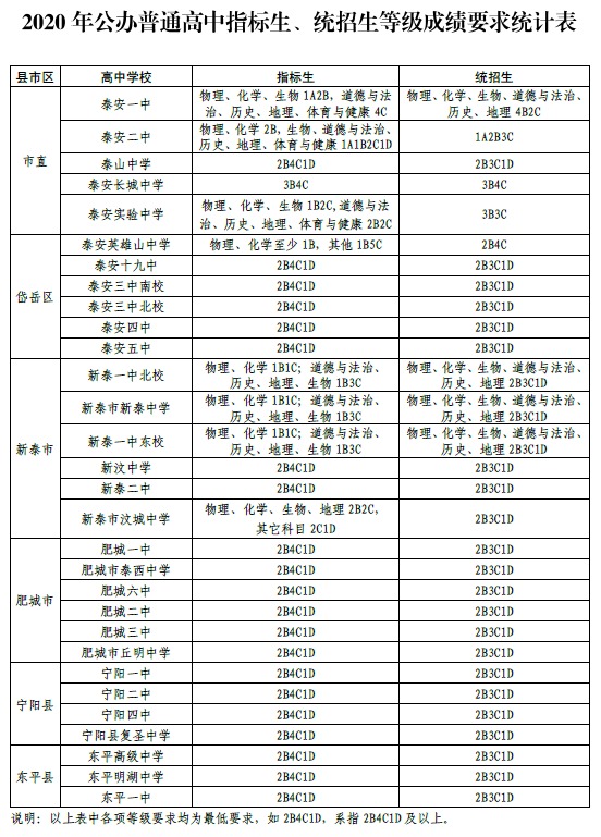 关于公布2020泰安公办普通高中指标生统招生等级成绩要求的通知