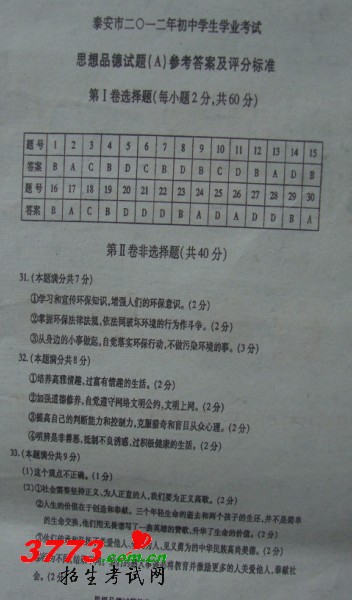 2012泰安市中考政治试题答案及评分标准