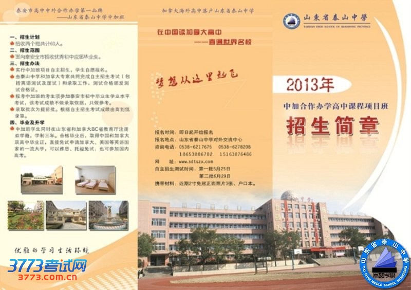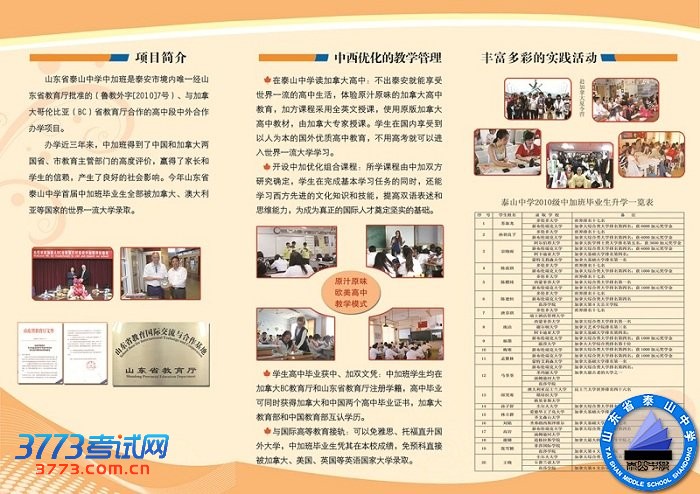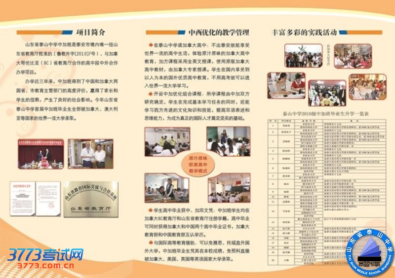 山东省泰山中学中加班是泰安市境内唯一经山东省教育厅批准的(鲁教外字[2010]7号)、与加拿大哥伦比亚(BC)省教育厅合作的高中段中外合作办学项目。