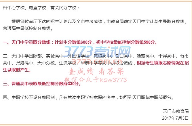 天门中学录取分数线:计划生分数线608分,初中学校最低控制分数线598分。