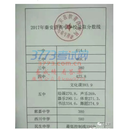 2017秦安县中考分数线:一中、二中、三中、四中、五中