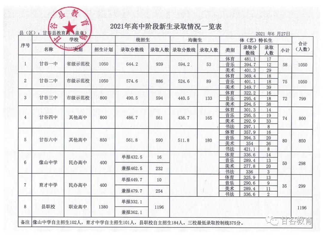 2021年甘谷县中考中招工作在县招委的统一领导下,县教育局坚持公平公正的原则,严格按照规定程序,强化全流程管理,积极回应群众关切。于6月26日完成了2021年高中阶段学校招生的划线及录取工作。经6月27日局务会议审定并报请市教育局审核同意。现予以公布。