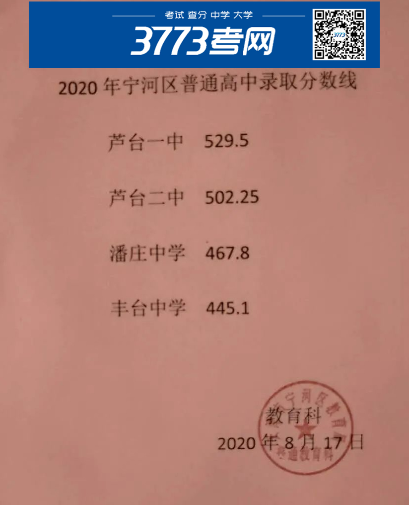 2020天津宁河区高中分数线公布