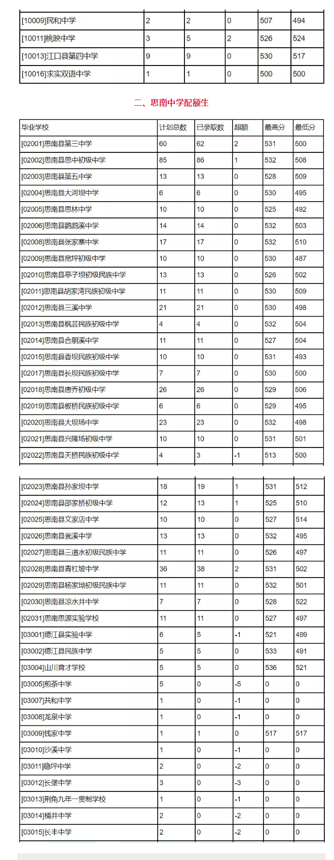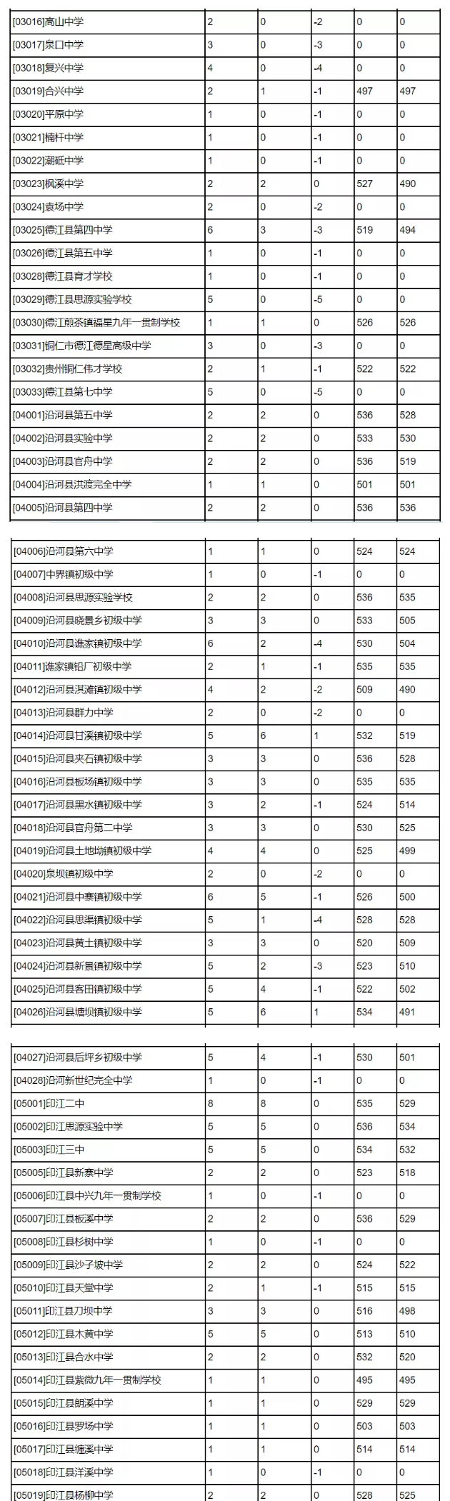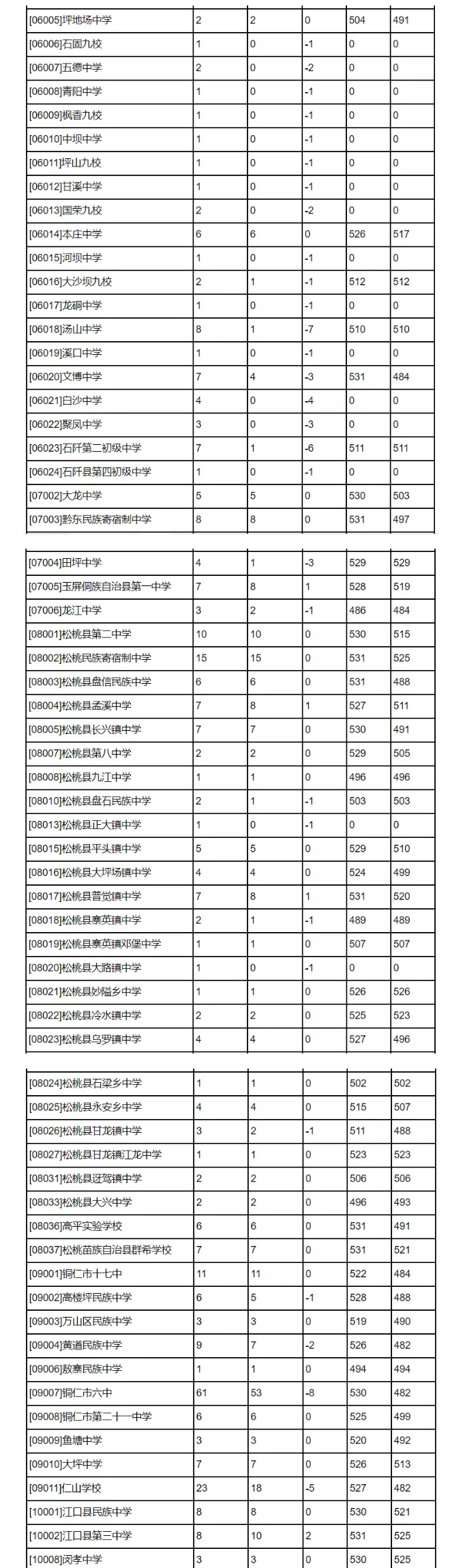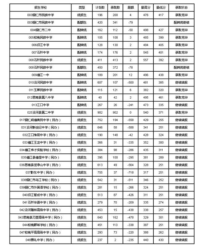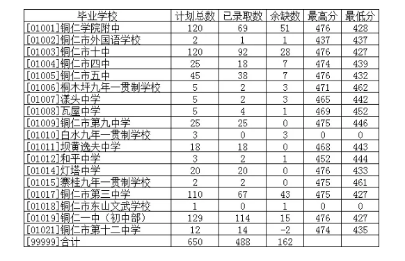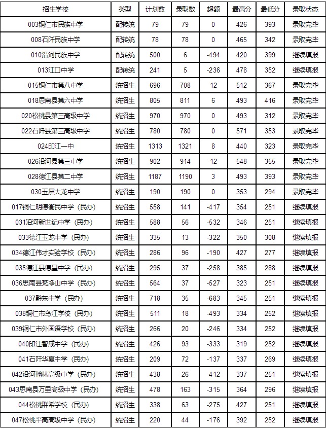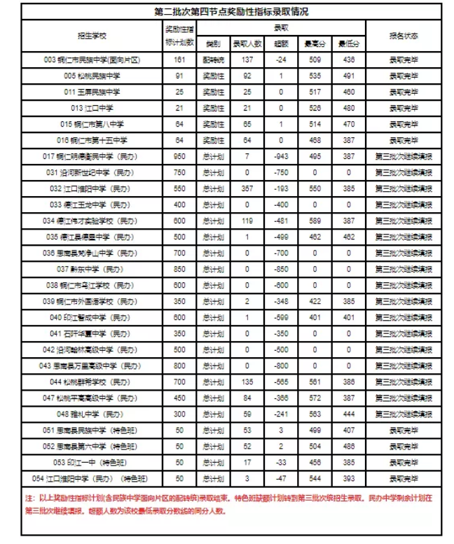 铜仁市2021年中考第三批次第一节点配额生录取情况