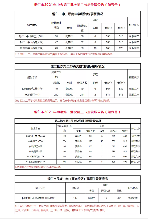 铜仁市2021年中考第一批次乡村振兴、民族生录取公告(第二号)