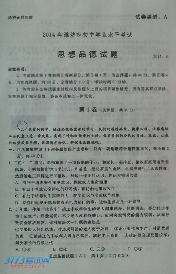 潍坊市2014年中考政治试题发布