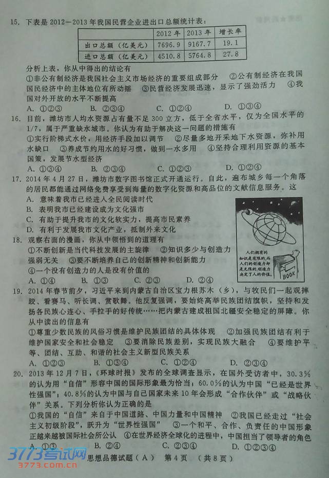 潍坊市2014年中考政治试题