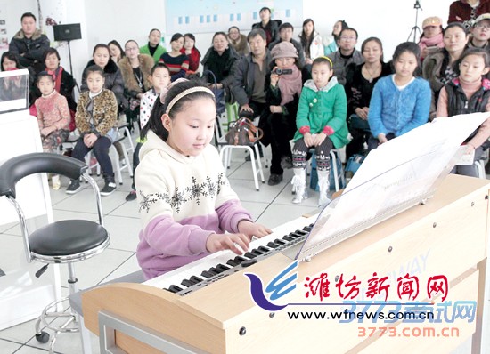在潍坊市青少年宫,一名小学员正在演奏双排键。 记者 张驰
