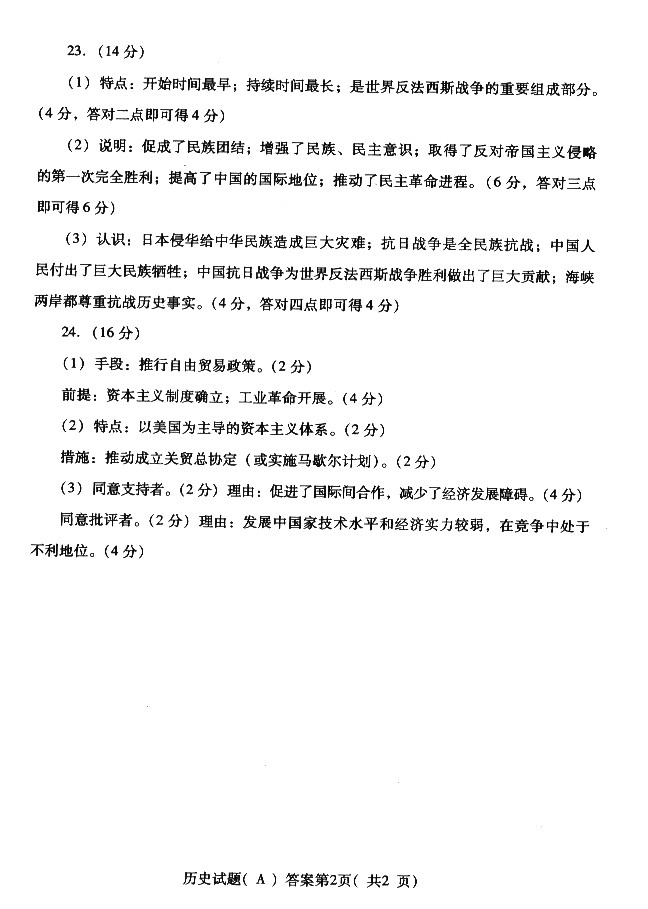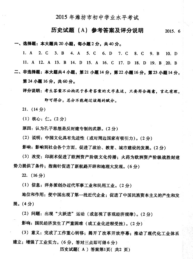 2015潍坊中考历史试题及答案评分标准