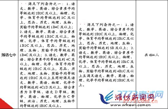 潍坊中学艺体特长生计划招80人,实际录取80人,需符合下列条件之一:1.排球、田径、武术专业合格证等级为A,且学业水平考试和综合素质原始等级置换后有4C以上等级,且体育单科成绩达到B等及以上等级;2.声乐、器乐、舞蹈专业合格证等级为A,且学业水平考试和综合素质原始等级置换后有8C以上等级;3.音体美考生获得该校专业成绩合格证,且学业水平考试和综合素质原始等级置换后有12C以上等级,根据专业等级提高相应科目等级,进行等级置换后,符合下列条件之一者录取为艺体特长生:(1).语数英综达到2B2C等级,理化体达到3B等级,政史地生实验达到5C等级;(2).语数英综达到2B2C等级,理化体达到1B2C等级,政史地生实验达到4B1C等级;(3).语数英综达到3B1C等级,理化体达到3C等级,政史地生实验达到1B4C等级。