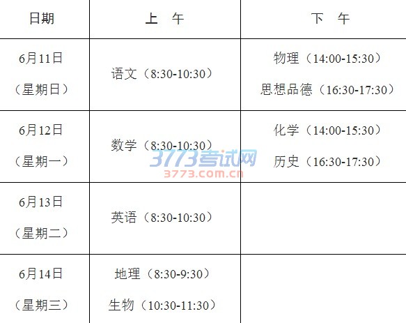 语文、数学、英语、物理、化学、思想品德、历史、地理、生物等9科的学业水平考试,实行全市统一考试,市区统一组织。考试时间为6月11日—14日。各科具体考试时间如下: