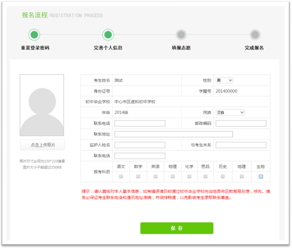 4月25日-27日,每天8:00至22:00进行网络报名。考生在监护人的监护之下可在此时间段内登录潍坊教育信息港“中考平台”系统(图1),进行学业水平考试报名、考试科目、志愿填报,填写相关信息,并上传考生本人近期电子照片(分辨率为210像素(高)*150像素(宽),jpg格式,大小不超过150K)。