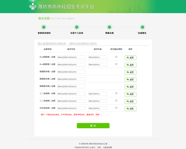 考生根据各自县市区的招考政策(普通高中志愿数量不同)和自己的报考意向,分别在不同的志愿类型(3+4、普通高中、三二连读和五年一贯制、普通中专职业中专技工学校)中选择报考学校、报考专业、是否服从调剂,确认无误后点击“保存”按钮。如需修改,点击“重置”按钮,重新填写内容。(图5)