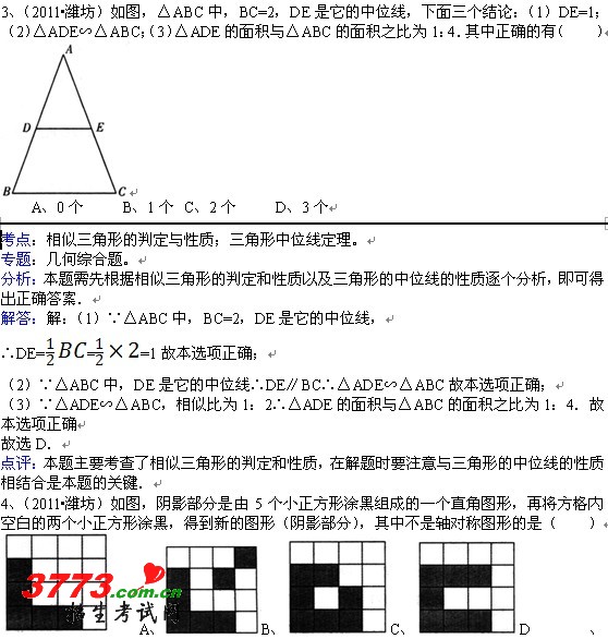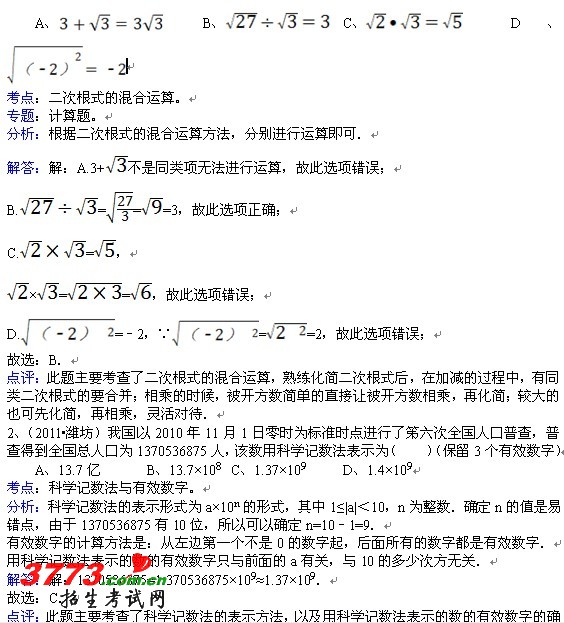 内容预览: 山东省潍坊市2011年中考数学试卷-解析版 一、选择题(共12小题,每小题3分,满分36分) 1、(2011?潍坊)下面计算正确的是( ) A、B、C、D、 考点:二次根式的混合运算。 专题:计算题。 分析:根据二次根式的混合运算方法,分别进行运算即可. 解答:解:A.3+不是同类项无法进行运算,故此选项错误;