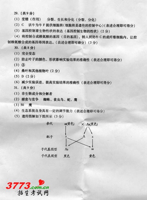 2012潍坊中考生物试题答案及评分标准