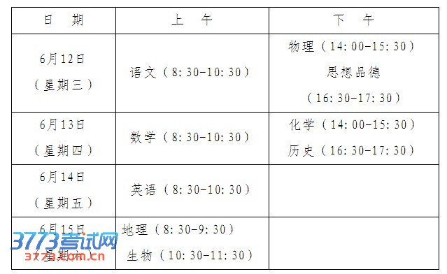 语文、数学、英语、物理、化学、思想品德、历史、地理、生物等9科的学业水平考试,实行全市统一考试,市区统一组织。考试日期为6月12日—15日,具体安排如下: